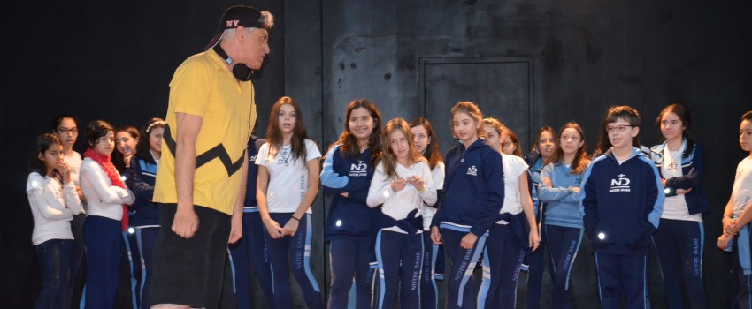 Os estudantes do Colégio Notre Dame Rainha matriculados na Atividade Extracurricular de Teatro receberam o ator, dublador e músico Mauro Gasperini, na sua última aula do semestre.