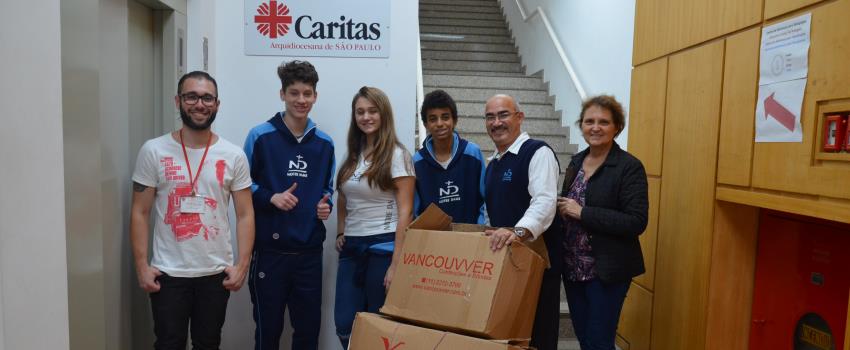 Com as arrecadações devidamente separadas e catalogadas, os educandos que integram o grupo de Pastoral Escolar Juventude Notre Dame,  juntamente com a vice-diretora do Colégio, Irmã doaçaoLurdes Stefanello e com o educador Francisco Rocha, entregaram as doações na Cáritas Brasileira. A entidade, que é um organismo da Conferência Nacional dos Bispos do Brasil (CNBB), trabalha com a promoção dos direitos humanos, da segurança alimentar e do desenvolvimento sustentável solidário. Sua principal atuação é junto às pessoas em situação de vulnerabilidade social, onde executa ações em defesa da vida e da construção solidária de uma sociedade justa, igualitária e plural.