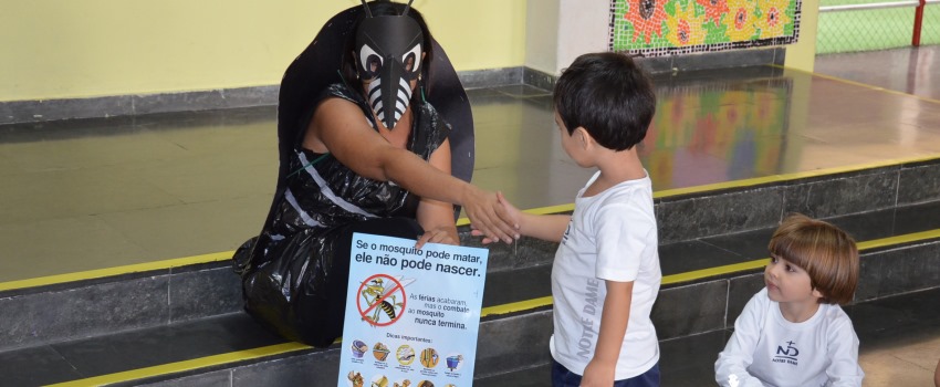 A partir de uma campanha de conscientização realizada pela Rede de Educação Notre Dame, o Colégio Notre Dame Rainha está empenhando em combater a proliferação do mosquito Aedes aegypti nas suas dependências e, também, em mobilizar sua comunidade educativa para fazer o mesmo. Por isso, as crianças matriculadas nos diferentes segmentos da Educação Infantil receberam a visita do “mosquito”, que procurava por água parada para colocar seus ovos.