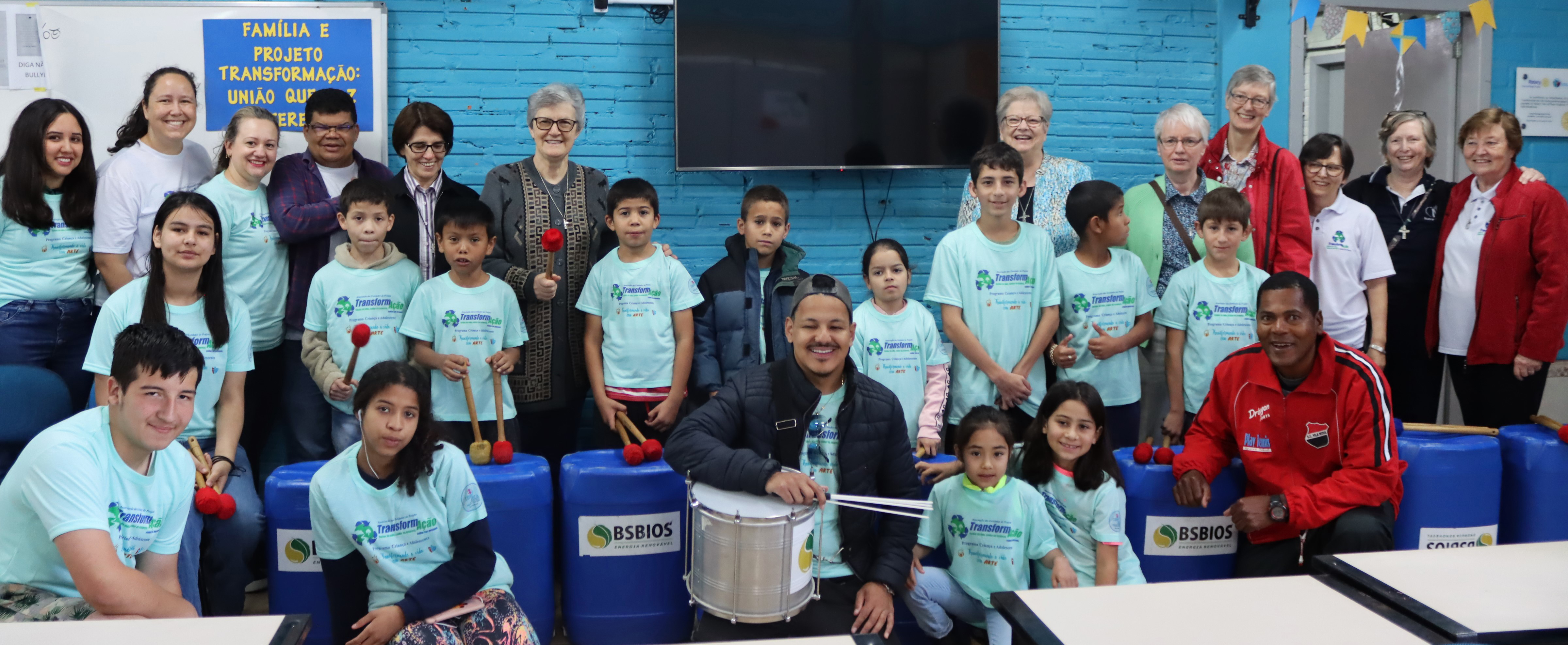 éticos e humanos, as crianças e adolescentes presentes requisitaram que as religiosas vivenciassem alguns ritmos brasileiros executados por meio da percussão. Dispostas a demostrar seu apreço pelo convite, elas tocaram os instrumentos feitos com materiais reciclados e reutilizados confeccionados pelos alunos no contraturno escolar.