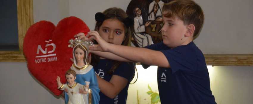 Ao término do mês em que, tradicionalmente, se celebra a doação ao projeto de Deus daquela que gestou o Seu filho, a comunidade educativa do Colégio Notre Dame Rainha dos Apóstolos  participou da Coroação de Nossa Senhora – gesto que remete ao de Jesus, após a ascensão de sua mãe ao céu.