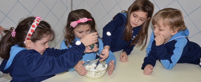 Com o intuito de fixar saberes sobre a consoante P, os educandos matriculados no 1º Ano do Ensino Fundamental do Colégio Notre Dame Rainha, que estão em processo de alfabetização, participaram de aula de culinária.