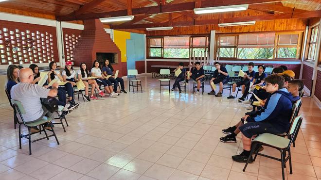 Os educandos do 7º Ano do Ensino Fundamental, por exemplo, já se deslocaram até a sede campestre do educandário, distanciando-se do ritmo cotidiano e desfrutando das condições necessárias para que pousassem um olhar mais atento sobre si, sobre o outro e sobre os valores que orientam as relações. Reunidos na Chácara Primavera, localizada em Itatiba (SP), eles foram instigados a analisar os elementos essenciais à identidade do estudante Notre Dame, em um exercício que mobilizou não apenas o pensamento, mas também a escuta, a postura e a responsabilidade coletiva.