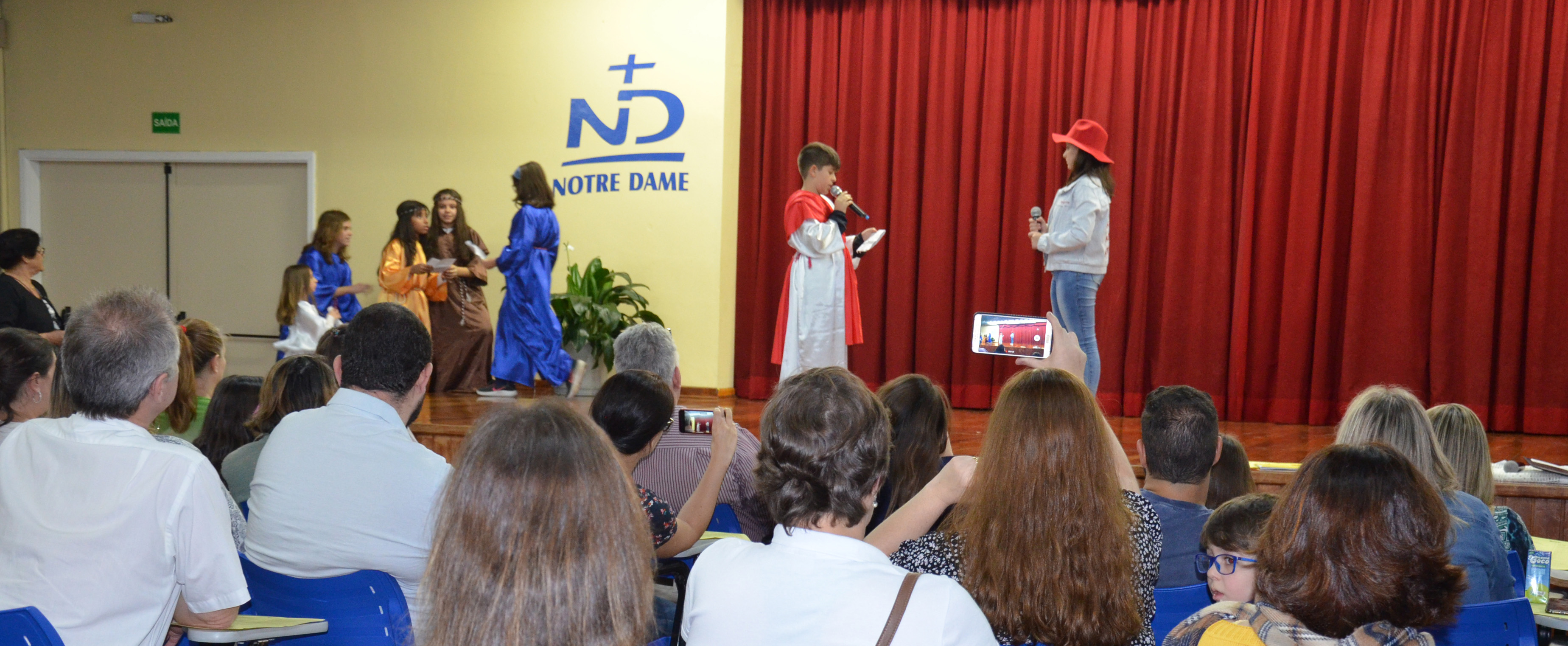 Para participar do evento, que foi organizado pela Pastoral Escolar, os presentes reuniram-se no auditório do educandário, onde assistiram a encenação de quatro parábolas bíblicas: a do “Bom Samaritano”, a do “Bom Pastor”, da “Multiplicação dos pães” e “Deixai vir a mim as crianças”.