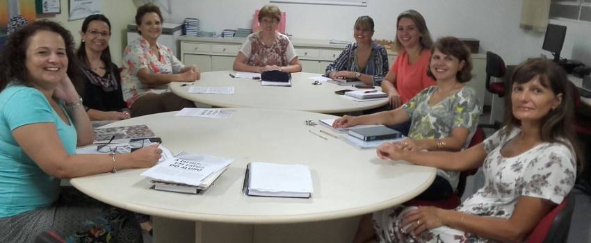 Na retomada nos trabalhos para o ano letivo de 2016, a diretora do Colégio Notre Dame Rainha dos Apóstolos, Ir. Elena Bini, a vice-diretora Ir. Lurdes Stefanello e as coordenadoras Luciana Leite, Leilian Pantaleão, Agnis Caparrós e Regina Sacramento e a psicopedagoga Elaine Amorim se reuniram durante a semana para planejar os encaminhamentos para o período.