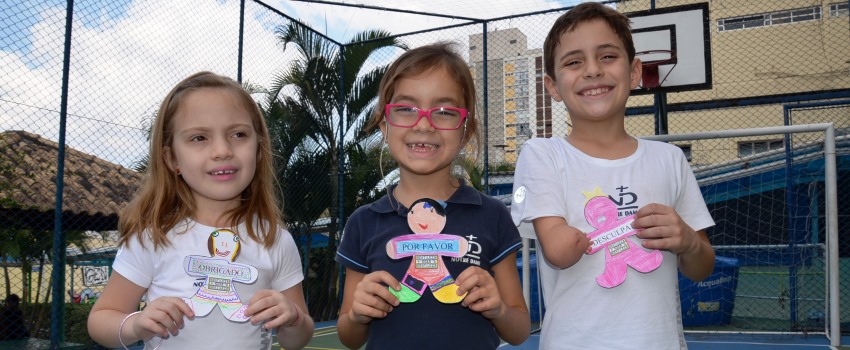 Já, as crianças matriculadas na Educação Infantil plantaram sementes para um mundo melhor, numa alusão, também, ao tema da Campanha Fraternidade Ecumênica de 2016 – “Casa Comum, Nossa Responsabilidade”. Elas ainda confeccionaram bonecos que incentivam o uso das “palavrinhas mágicas”: obrigada, com licença, desculpe e por favor. Enquanto isso, os estudantes de todos os segmentos do Ensino Fundamental I participaram de atividades nas quais exprimiram palavras gentis, fosse por meio de bonecos, de balões de ou fitas da sorte.