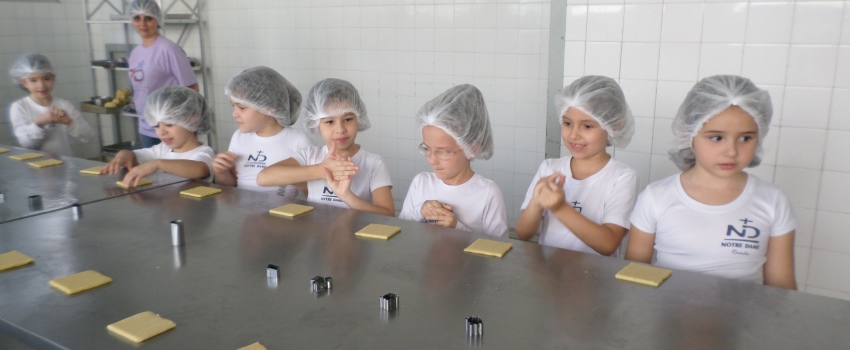 Os estudantes do 1º Ano do Ensino Fundamental participaram de uma visita à fábrica de alimentos Di Cunto. Nela, eles puderam verificar, na prática, temas estudados por eles durante o primeiro semestre letivo, como os alimentos que compõem os grupos alimentares e que devem ser consumidos de forma equilibrada e noções de compra e venda.