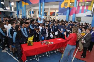 Possibilitando aos estudantes um profundo aprendizado, que em muito transcende o dos conteúdos programáticos, o Colégio Notre Dame Rainha dos Apóstolos recebeu, na segunda-feira (01), a ex-aluna Patrícia Fonseca. Triatleta transplantada do coração e fundadora do Instituto Sou Doador, a coautora da Lei Tatiane – que visa à conscientização escolar quanto a doação de órgãos -, ainda foi surpreendida com uma homenagem prestada pela instituição onde cursou todo o Ensino Básico: um grafite representando a primeira medalha olímpica conquistada pela esportista, o qual ornamenta o entorno da quadra poliesportiva.