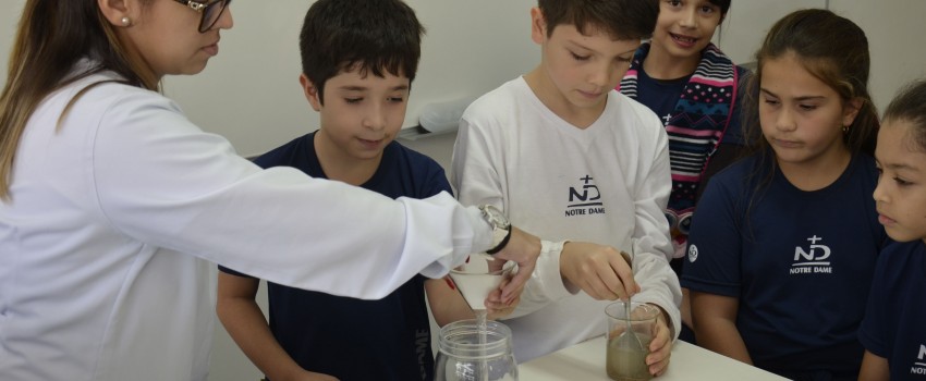 O Colégio Notre Dame Rainha dos Apóstolos disponibiliza aos estudantes diferentes espaços pedagógicos, com o intuito de que possam complementar e aprofundar saberes relativos às mais variadas disciplinas. Um deles é o Laboratório de Ciências e Biologia – local visitado pelos educandos do 4º Ano do Ensino Fundamental, para que assistissem à realização de experimentos sobre a água.