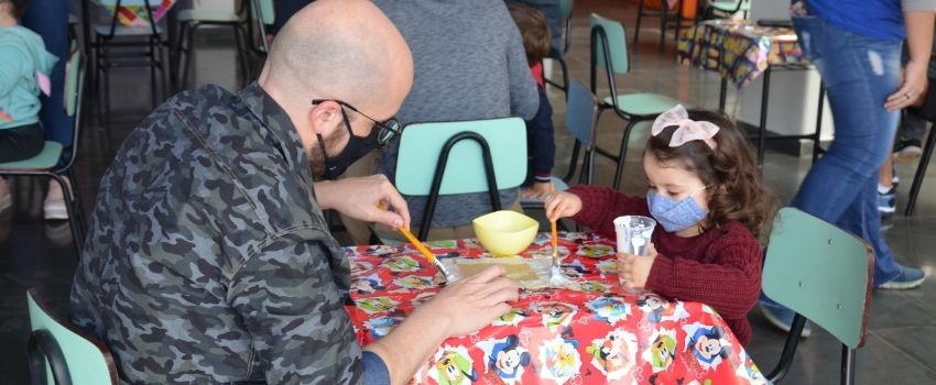 Dessa forma, a instituição de ensino oportunizou que as figuras paternas experimentassem algumas das vivências que, viabilizando aprendizagens significativas à vida, perpassam a rotina dos educandos. Afinal, após prestigiarem as apresentações artísticas carinhosamente protagonizadas pelos filhos, os convidados uniram a sua destreza às pequeninas mãos infantis, em uma atividade de construção que culminou com a confecção do porta-retratos que marca a passagem da data comemorativa. Além disso, eles foram desafiados a colocarem-se diante das crianças, reproduzindo atentamente os passos da coreografia demonstrada pela equipe pedagógica.