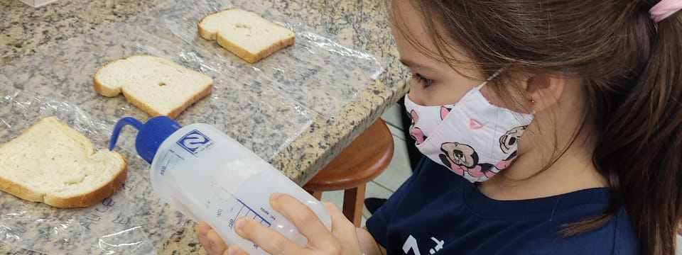 Reunidos no Laboratório de Ciências da instituição de ensino, os educandos seguiram as instruções do sábio boneco feito de sabugo de milho, a fim de observarem as transformações ocorridas em fatias de pão que, após terem sido removidas da embalagem, foram umedecidas e armazenadas.